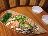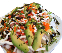 Exquisitas Tostaditas de Harina, cubiertas con un aderezo de 3 mariscos: camarón, salmón y kanikama, todos perfectamente sazonados con un toque picante. La combinación de sabores y la textura crujiente de las tostaditas te transportarán a una experiencia culinaria única.