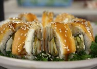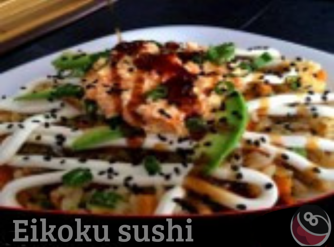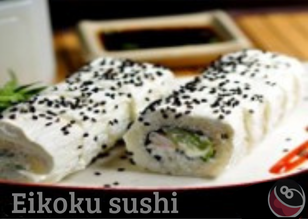 Descubre el 'Eikoku Roll', un rollo empanizado con queso gratinado y aderezo de masago. Coronado con camarón empanizado y bañado en salsa de anguila, realzado con ajonjolí..