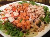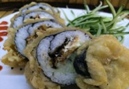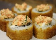 Descubre el Takemi, un sushi empanizado con una deliciosa coronación de ensalada de surimi. Relleno de mariscos como camarón, surimi, salmón, pulpo o atún, queso Philadelphia, pepino y aguacate.