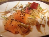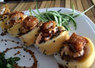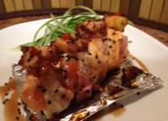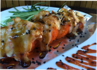 Exquisitos Rollitos de Salmón y Atún, rellenos de fresca Ensalada Kanikama, bañados en una deliciosa Salsa de Anguila y coronados con crujiente ajonjolí.