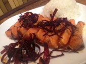 Experimenta la exquisitez de nuestro Salmón al Güajillo: una lonja de salmón sellada con la perfecta combinación de salsa al güajillo y especias, que resaltan su frescura y sabor único. Acompañado de arroz blanco para complementar esta experiencia.