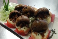 Deléitate con nuestro 'Kinoko Maki', un rollo con masago por fuera y queso gratinado, realzado con aderezo de masago. En la cúspide, champiñones salteados rellenos de camarón al ajo, complementados con salsa de anguila y ajonjolí.