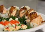 Prueba nuestra deliciosa 'Dragon Ball': una bola de arroz envuelta en salmón, rellena de ensalada de 3 mariscos y salsa vietnamita. Coronada con ajonjolí y cebollín para un toque crujiente y fresco.