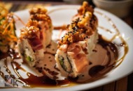 Experimenta nuestro 'Serrano Roll', un rollo con jamón serrano por fuera, coronado con aderezo de masago y camarón empanizado. Bañado en salsa de anguila, realzado con ajonjolí.